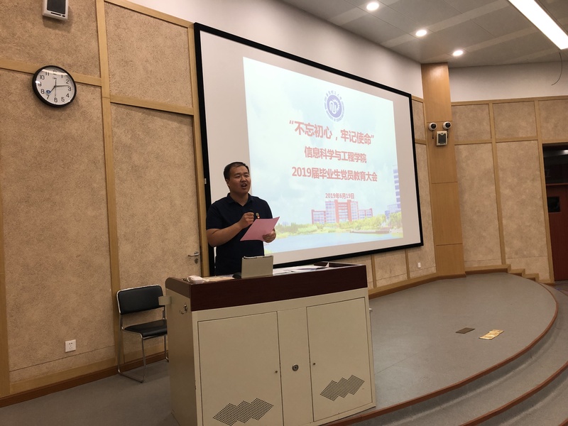 会上,学院党委书记侍洪波以“不忘初心,勇担使命,做走在时代前列的奋进者”为题,为全体毕业生党员上了一堂生动的党课。他围绕深入学习领会习近平总书记在“不忘初心、牢记使命”主题教育工作会议和纪念五四运动100周年大会上的重要讲话精神,从“不断加强学习、强化党员意识、牢记使命担当”,“担当时代责任、珍惜青春韶华、创造精彩人生”,“严明纪律要求,强化组织观念,确保文明安全离校”几方面,强调毕业生党员要通过加强学习,增强“四个意识”、坚定“四个自信”、做到“两个维护”;要进一步强化党性意识、宗旨意识,认真思考如何答好“守初心”这张新时代的政治答卷,以社会主义建设者和接班人的使命担当,为全面建成小康社会、全面建设社会主义现代化国家而努力奋斗;同时要坚持知行合一,珍惜时代机遇,担负时代使命,用实实在在的行动兑现自己的誓言,牢记初心、守住初心,在走向社会后,继续保持共产党员先进性,在各行各业中发挥先锋模范作用,做走在时代前列的奋进者、开拓者、奉献者。他鼓励所有毕业生党员在离校过程中严明纪律要求,强化组织观念,站好最后一班岗,发挥党员的带头作用,积极协助学校、学院做好毕业生文明、安全和有序离校工作,确保全体毕业生文明、安全离校。