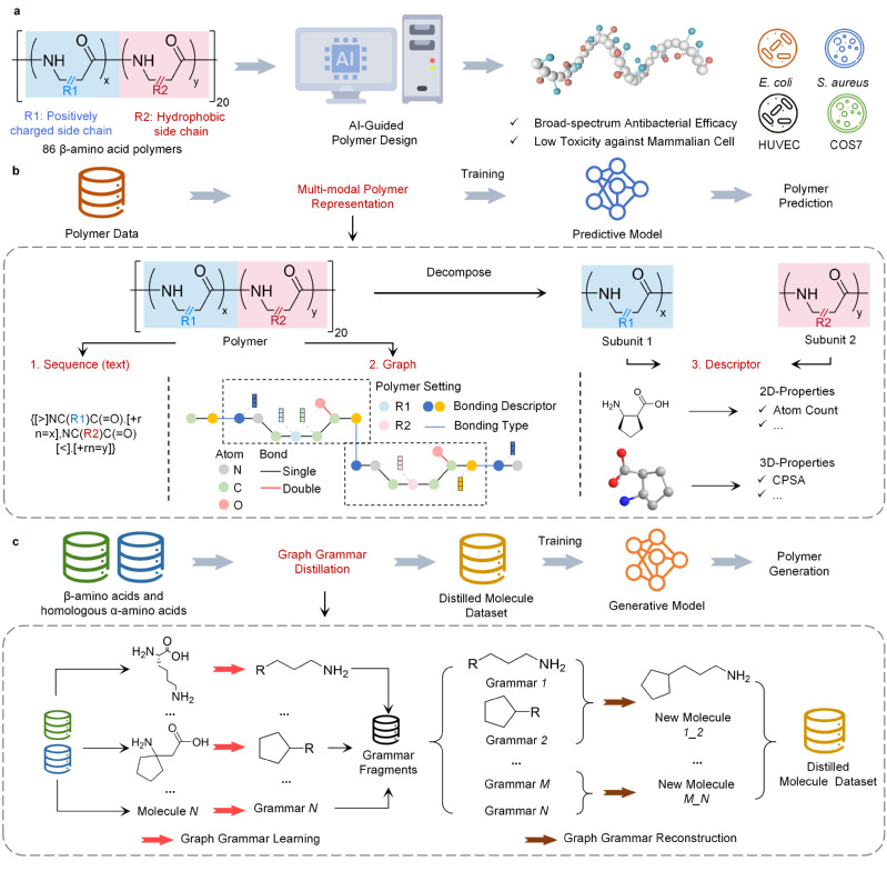 近日,日本三级 日本三级 唐漾教授与材料学院刘润辉教授在人工智能和抗耐药菌多肽模拟聚合物进行跨领域合作研究。首次在基于人工智能实现小样本多肽模拟聚合物活性预测和逆向设计研究中取得关键突破,仅依赖小样本(<100)结构与活性数据实现在庞大聚合物空间(>1060)中精准预测聚合物抗菌活性,并通过逆向设计发现大量具有突出广谱抗耐药菌活性和高选择性的优选聚合物结构,为抗耐药菌多肽模拟聚合物研究提供了新思路。该成果以“AI-guided Few-shot Inverse Design of HDP-Mimicking Polymers against Drug-Resistant Bacteria”(人工智能辅助抗耐药菌宿主防御肽模拟聚合物的小样本逆向设计)为题发表在Nature Communications 《自然•通讯》上(//www.nature.com/articles/s41467-024-50533-4)。