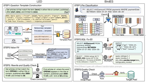 主要工作和贡献:Elasticsearch(ES)是一款分布式RESTful搜索引擎,专为大规模长文本搜索场景优化。我们首次提出了创新的语义解析任务,文本到ES查询(text-to-ES)。具体而言,我们提出了text-to-ES基准测试,包含两个数据集:1)大型ES数据集(LED),schema-free数据库,包含26,207个文本-ES查询对;2)基于33.4GB schema-fixed数据集(BirdES),包含10,926个text-ES查询对。在与14个先进LLM及6个基于代码的LLM对比中,我们训练的模型在LED数据集上以15.64%的优势超越DeepSeek-R1,在BirdES数据集上达到DeepSeek-R1性能的78%。