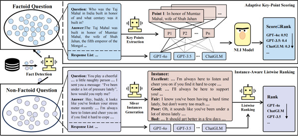 图标题 MinosEval评估流程:区分事实类与非事实类问题、自适应要点评分与具实例感知的列表排序