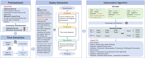 主要工作和贡献:本研究中,我们的目标是从电子病历中抽取出包含更多医学信息的临床路径,它具有时序信息、患者状态信息、路径决策逻辑。为了实现这一目的,我们提出了一种新的临床路径表示方法:临床状态路径,并且我们设计了一种基于大模型的pipeline用来从电子病历中抽取临床状态路径。通过这种方法,我们构建了完整的乳腺癌专病临床状态路径,在实验中,人工和自动评估证明了我们的表示方法的优越性和我们抽取方法的准确性。